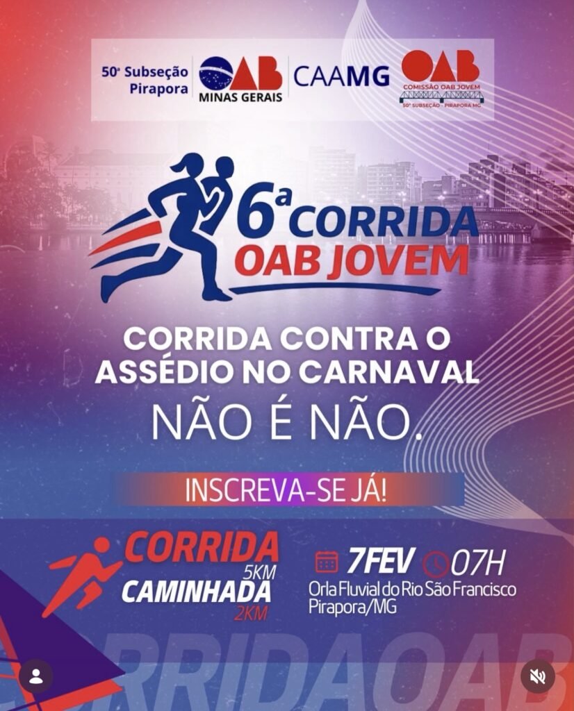 Corrida OAB Jovem – Pré-Carnaval 2026 é um evento esportivo, social e educativo que antecede o período carnavalesco com uma mensagem clara e necessária: “Não é Não”. Realizada pela OAB Jovem de Pirapora/MG, a corrida tem como objetivo promover a prática esportiva, a integração entre a advocacia e a comunidade, e, sobretudo, a conscientização e o combate ao assédio, reforçando a importância do respeito, do consentimento e da dignidade humana, especialmente durante o carnaval.O evento acontecerá no dia 07 de fevereiro de 2026, com concentração a partir das 07h, no Centro de Convenções de Pirapora, com percurso de 5 km pela Orla Fluvial do Rio São Francisco, em um trajeto plano, acessível e seguro, ideal tanto para corredores quanto para participantes da caminhada.